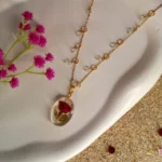 The Eternal Rose Bloom Pendant by Araesh captures the beauty of nature and the elegance of fine craftsmanship in one exquisite piece. This stunning pendant showcases a real preserved red rose encased in crystal-clear resin, symbolizing eternal love and grace.