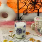 The Lavender Whisper Candle is a handmade, unscented candle featuring delicate pressed purple florals — perfect for calm, minimalist decor lovers.