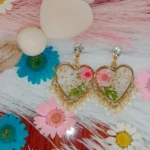 Pressed Flower Resin Heart Earrings-Pink Accent