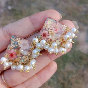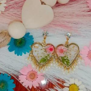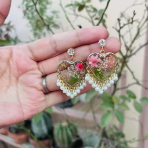 Pressed Flower Resin Heart Earrings-Pink Accent