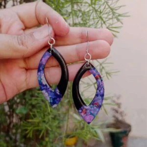 Eye Shaped Black Resin Earrings With Touch Of Blue Floral Print