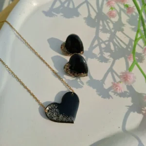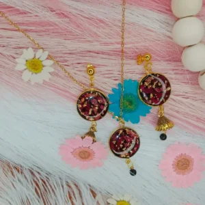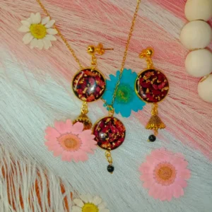 Mini Resin Pendant & Earrings with Crushed Rose on Black Base