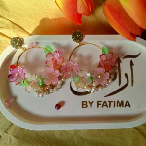 Flat Pressed White & Pink Flower Resin Jhumka With Blake Beads